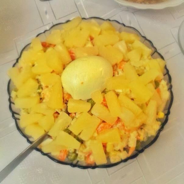 にんじん、グリーンピース、ピクルスを多分ヨーグルトとマヨネーズのソースで混ぜたサラダに