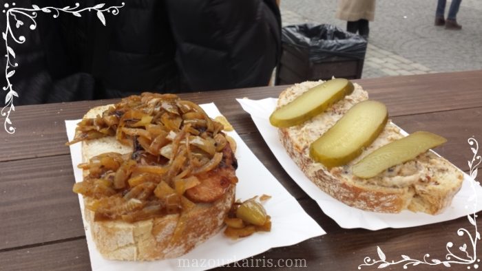 イベントの時期だと屋台でよくあるピクルスオープンサンド