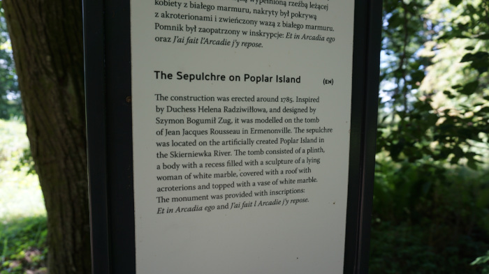 約200年の時を経て、「ポプラの島の墓」は、1778年にヘレナ・ラジヴィウ王女が創設したアルカディアのロマンティック・センチメンタルな庭園に帰ってきたのです。1785年頃、公爵夫人のためにシモン・ボグミウ・ツグが、ロマンチックな自然を賛美したエルメノンヴィレムのヨハン・ジャック・ルソーの墓を手本に設計したものである。