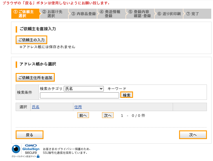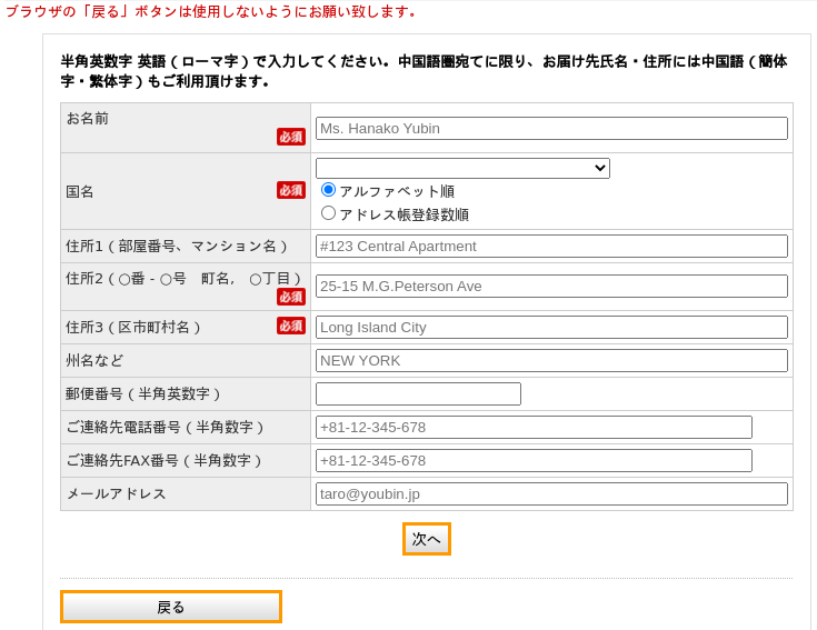 自分の住所を下の段で登録も出来るのでそちらから進んだ方が後が楽ですね。