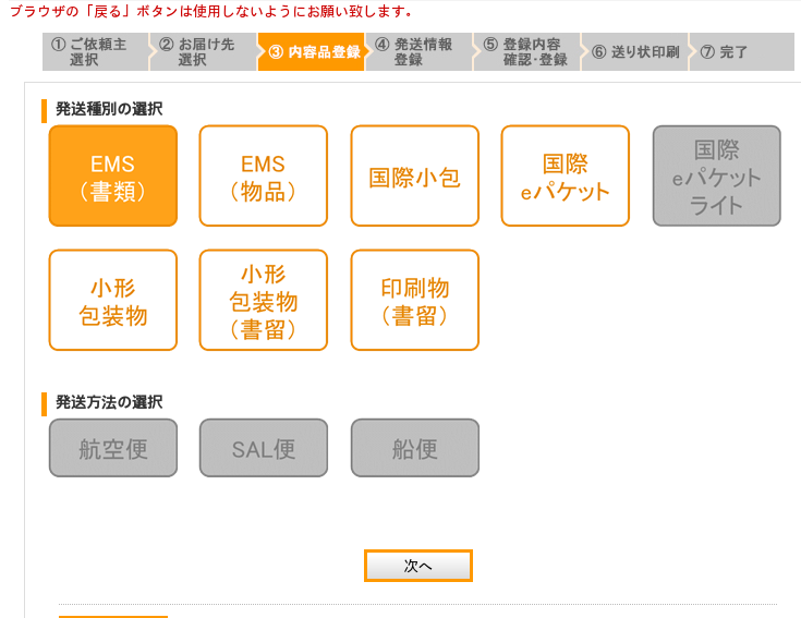 航空便、船便、航空便のSAL便が選べます。 |