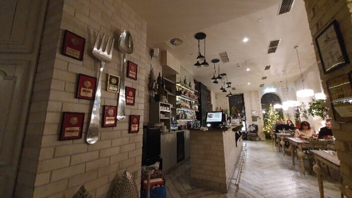 たくさんのプレートがついたプルジュナ通りの角にあるお店。