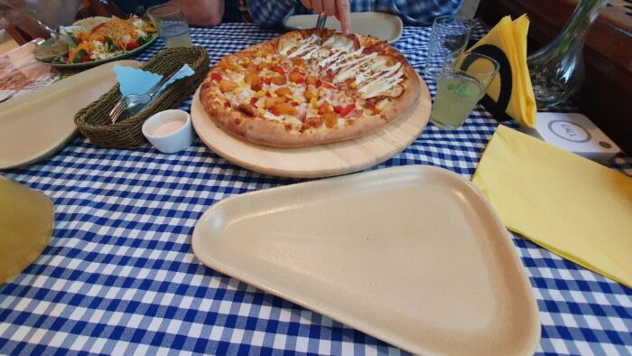 ハーフ&ハーフでスモークチーズのピザと、ハムとチキンのピザ。